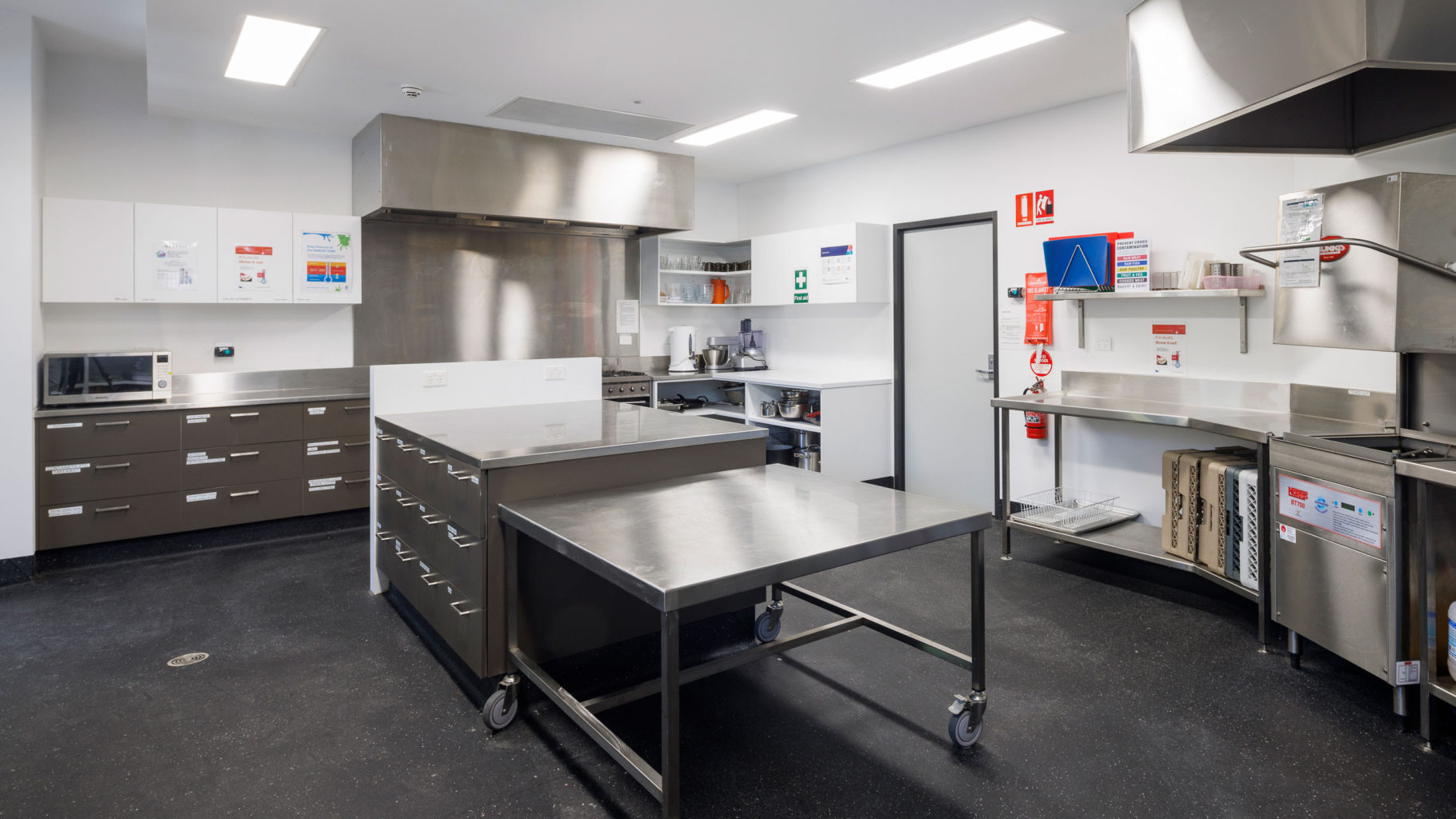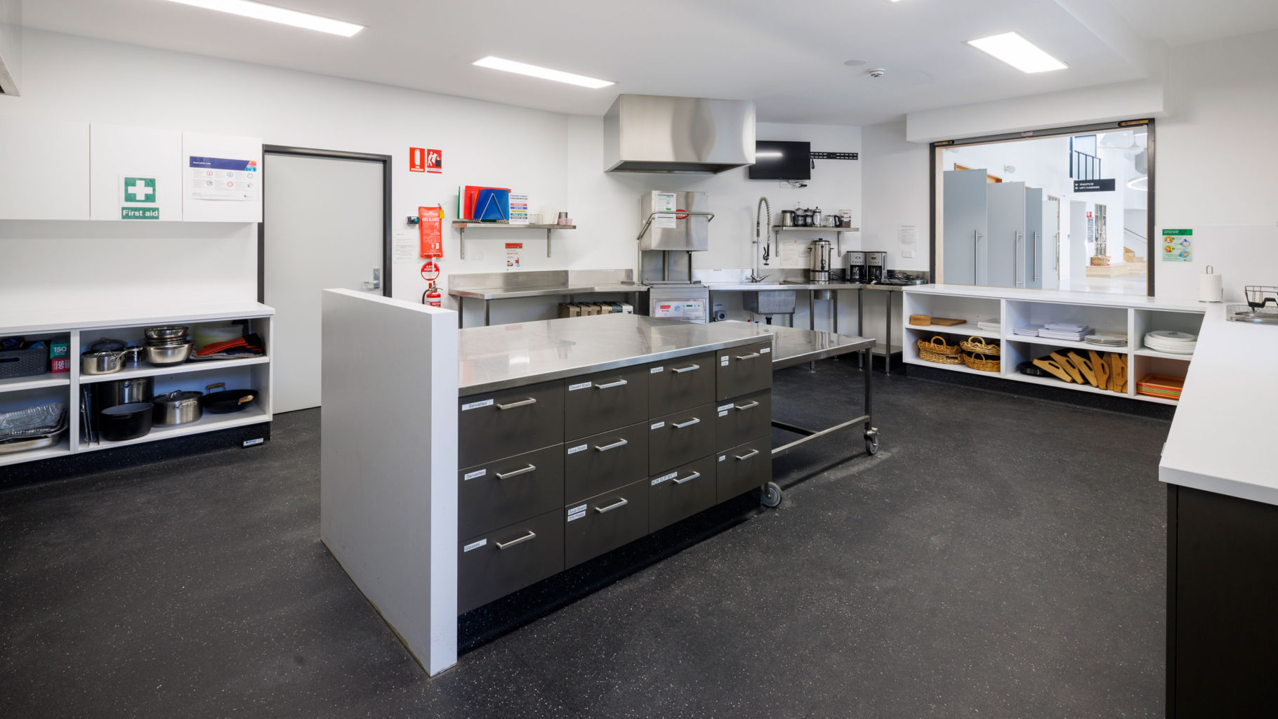 Community Kitchen is a commecially graded large kitchen with plenty of bench space, a double oven and cooktop, commercial dishwasher and a huge pantry with fridge and freezer. …more